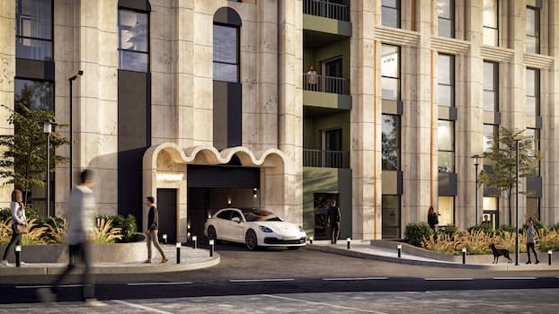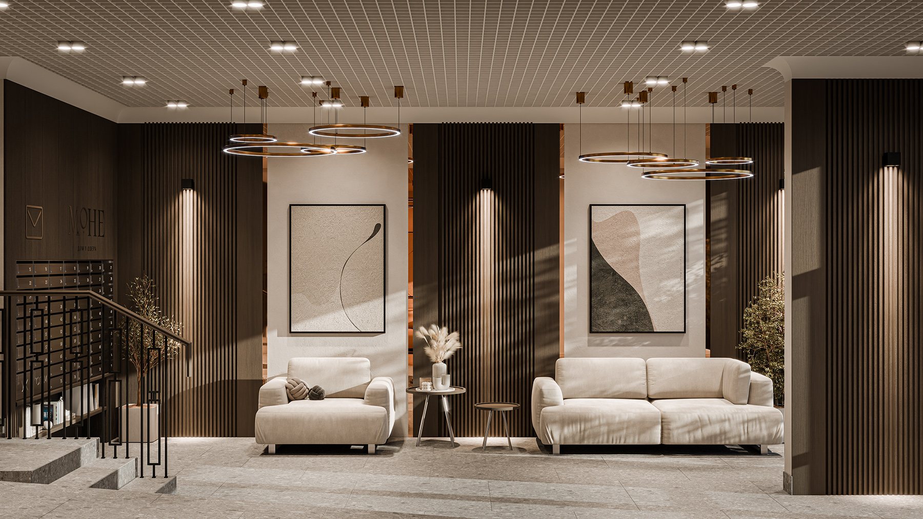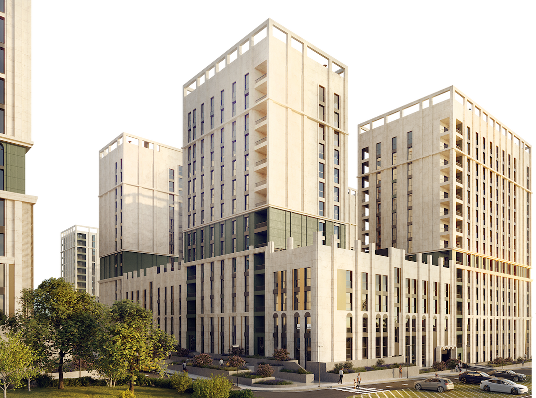 Величественные фасады из натурального травертина с латунными кассетами создают игру света и тени. Орнаментальное панно и декоративная арка символизируют связь классики с природой. Дом у озера «Моне» — бессмертное искусство архитектуры.