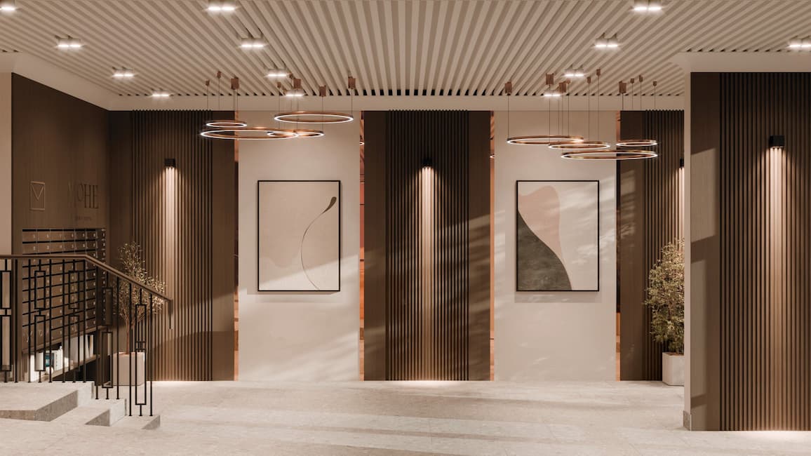 Величественные фасады из натурального травертина с латунными кассетами создают игру света и тени. Орнаментальное панно и декоративная арка символизируют связь классики с природой. Дом у озера «Моне» — бессмертное искусство архитектуры.